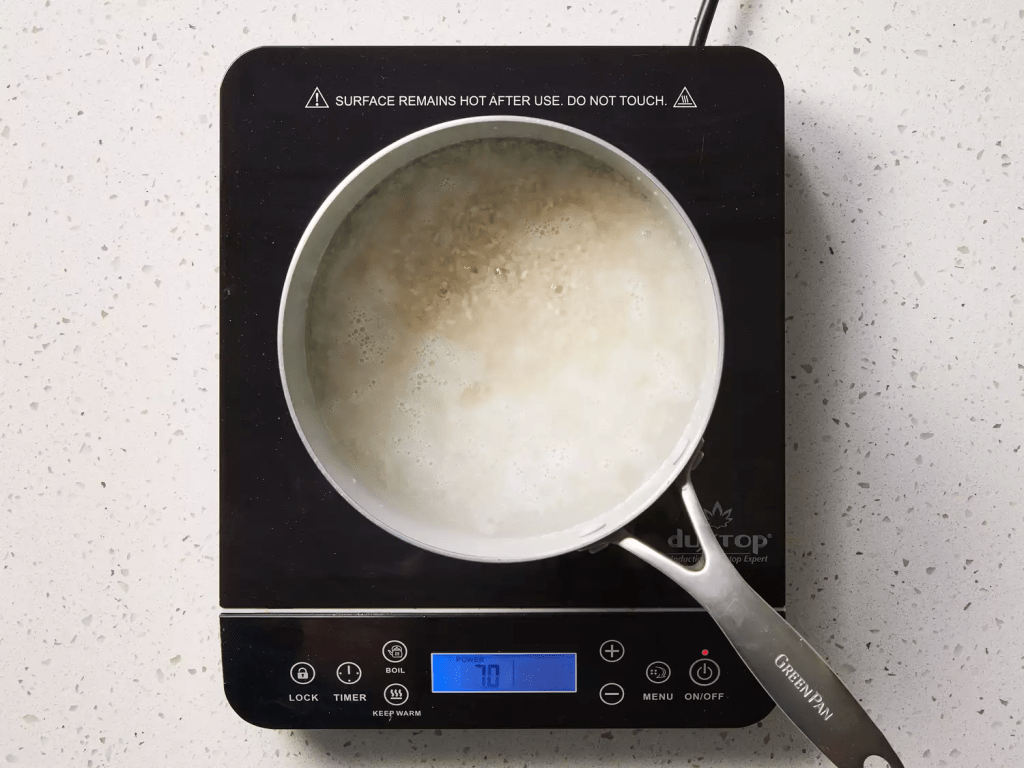 Ενώ το ρύζι ψήνεται, συνδυάστε 1 ½ φλιτζάνι γάλα καρύδας, 1 φλιτζάνι ζάχαρη (ή άλλο γλυκαντικό) και 1/2 κουταλάκι του γλυκού αλάτι σε μια άλλη κατσαρόλα. Αφήστε να πάρει μια βράση σε μέτρια φωτιά. αποσύρουμε από τη φωτιά και αφήνουμε στην άκρη.