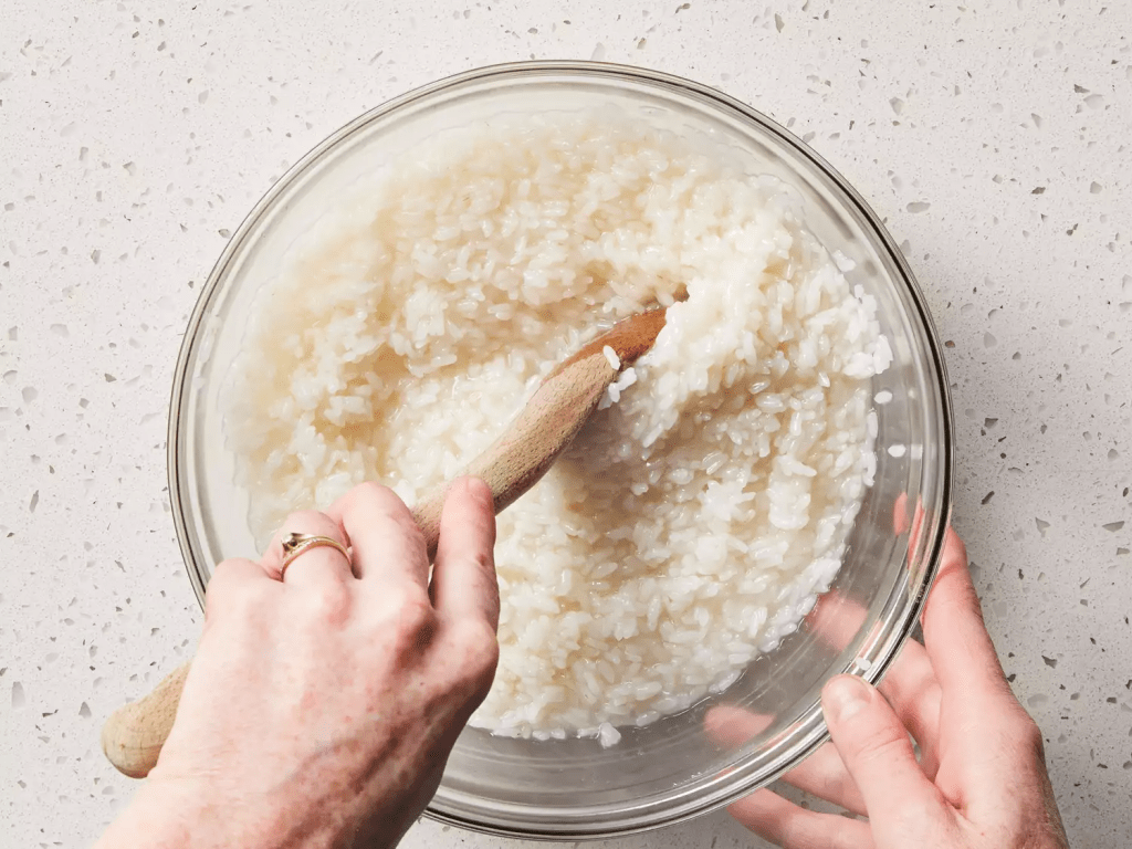 Ανακατέψτε το μαγειρεμένο ρύζι στο μείγμα γάλακτος καρύδας. Σκεπάζουμε και αφήνουμε να κρυώσει για 1 ώρα.