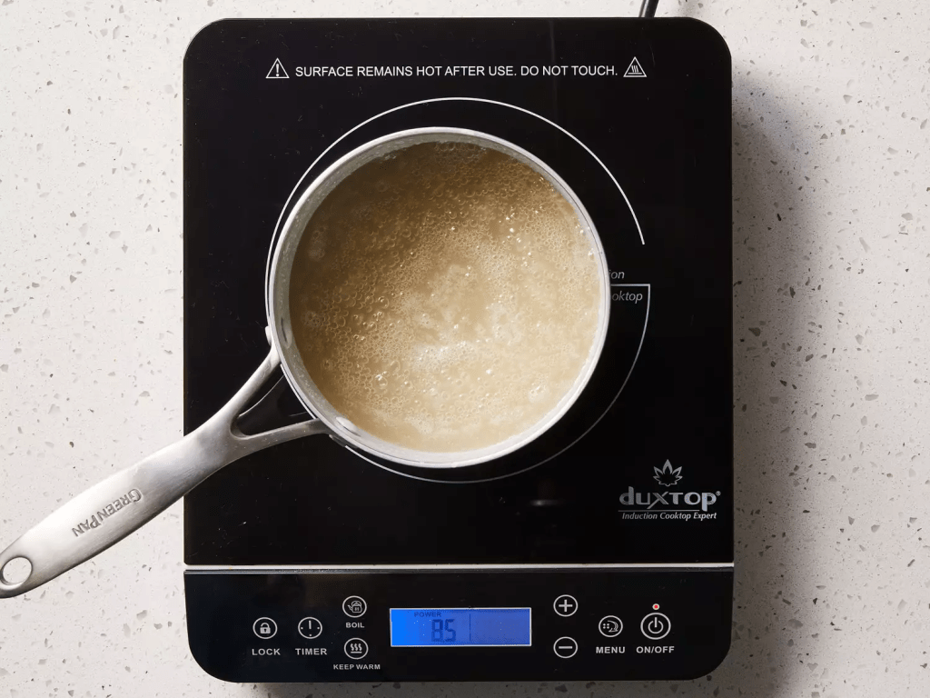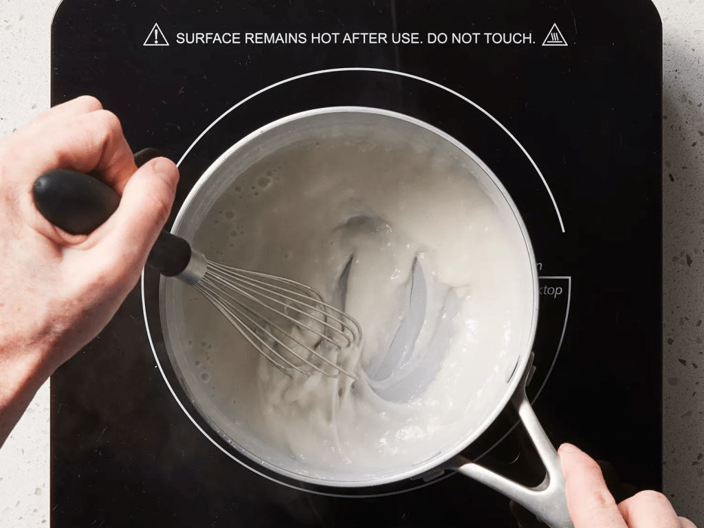 Φτιάξτε μια σάλτσα συνδυάζοντας 1/2 φλιτζάνι γάλα καρύδας, 1 κουταλιά της σούπας ζάχαρη(ή άλλο γλυκαντικό), 1/4 κουταλάκι του γλυκού αλάτι και άμυλο ταπιόκας (ή κορν φλάουρ) σε μια άλλη κατσαρόλα. αφήνουμε να πάρει μια βράση. Μαγειρέψτε και ανακατέψτε μέχρι να πήξει.