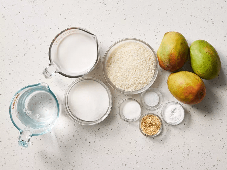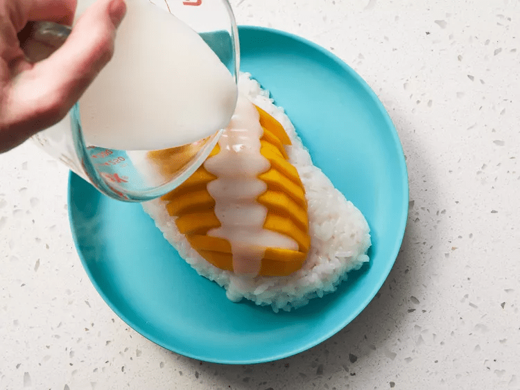 Τοποθετήστε ρύζι καρύδας σε ένα πιάτο σερβιρίσματος και από πάνω τοποθετήστε μάνγκο. Περιχύνουμε με σάλτσα τα μάνγκο και το ρύζι.